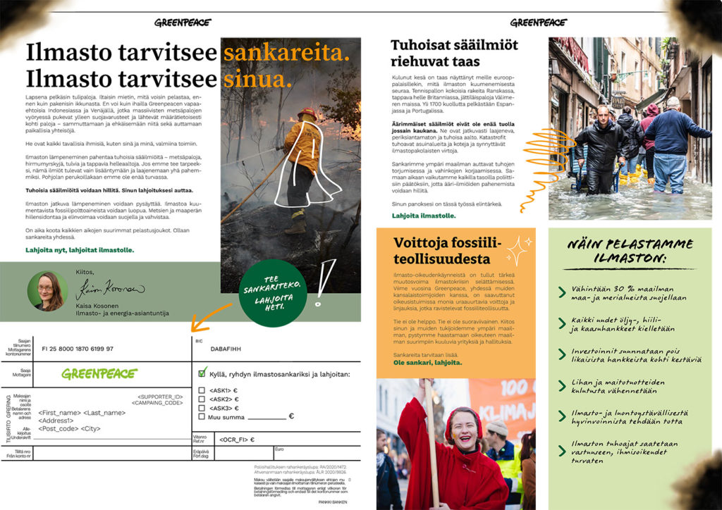 Suunnittelimme Greenpeacelle varainkeruun suorakampanjointiin konseptin, joka uudistaa vuosia jatkunutta viestinnän linjaa. Haasteena oli löytää riittävästi uutta, jotta viesti tehoaa, mutta olla samalla rikkomatta toimivaa varainkeruukonetta. Konseptin suunnittelun lisäksi kirjoitin yhdessä GP:n asiantuntijan kanssa suoran sisällöt.